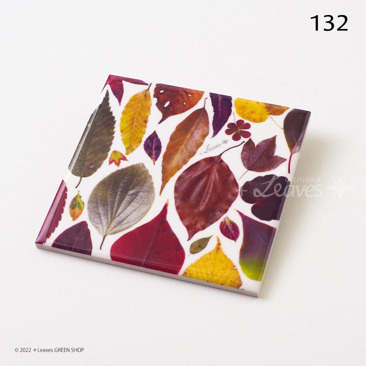 クスノキ、エノキ、サクラ、ケヤキ、カツラなど茶色や黄土色の冬の枯葉や、ナンキンハゼなど赤く色付いた秋の紅葉を中心とした、さまざまな形の葉っぱを散りばめてレイアウトし、白い半磁器タイルにプリントして、表面を艶のある樹脂でコーティングしています。