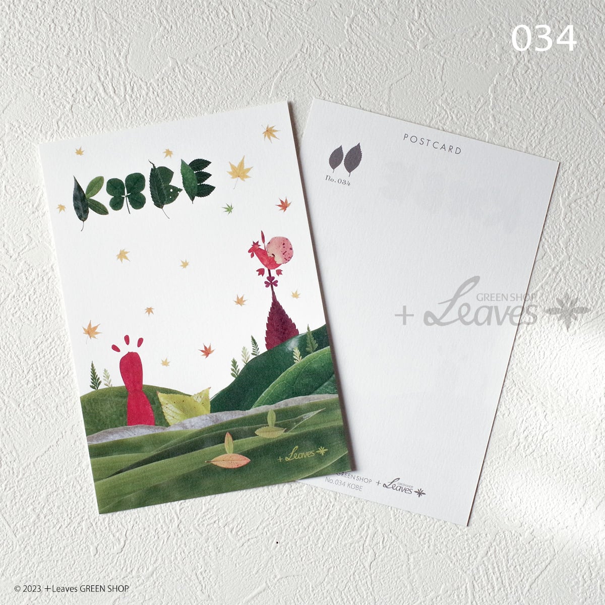 海と山、ポートタワーや北野異人館、百万ドルの夜景が輝くKOBEの景色を葉っぱで描いたポストカード